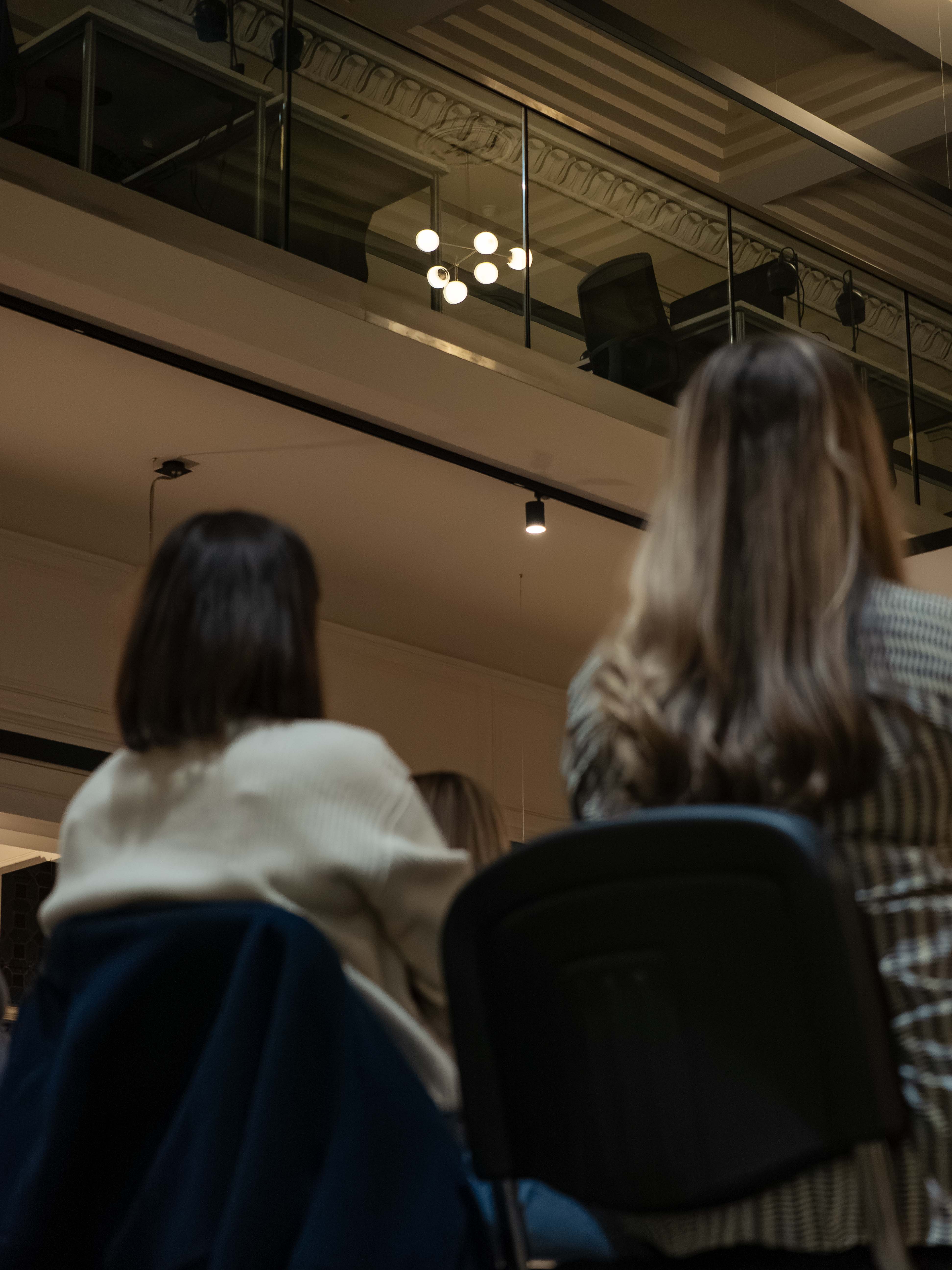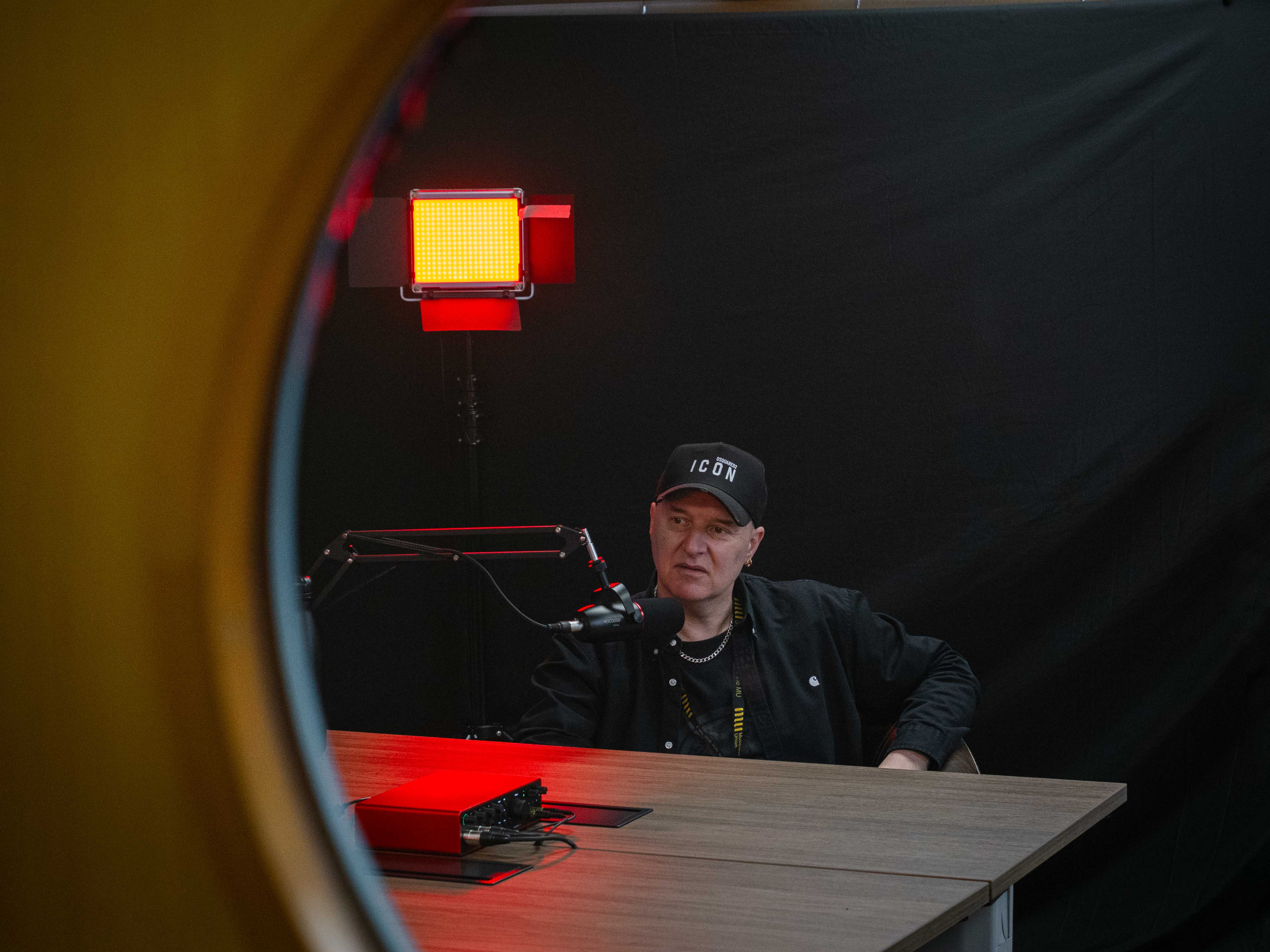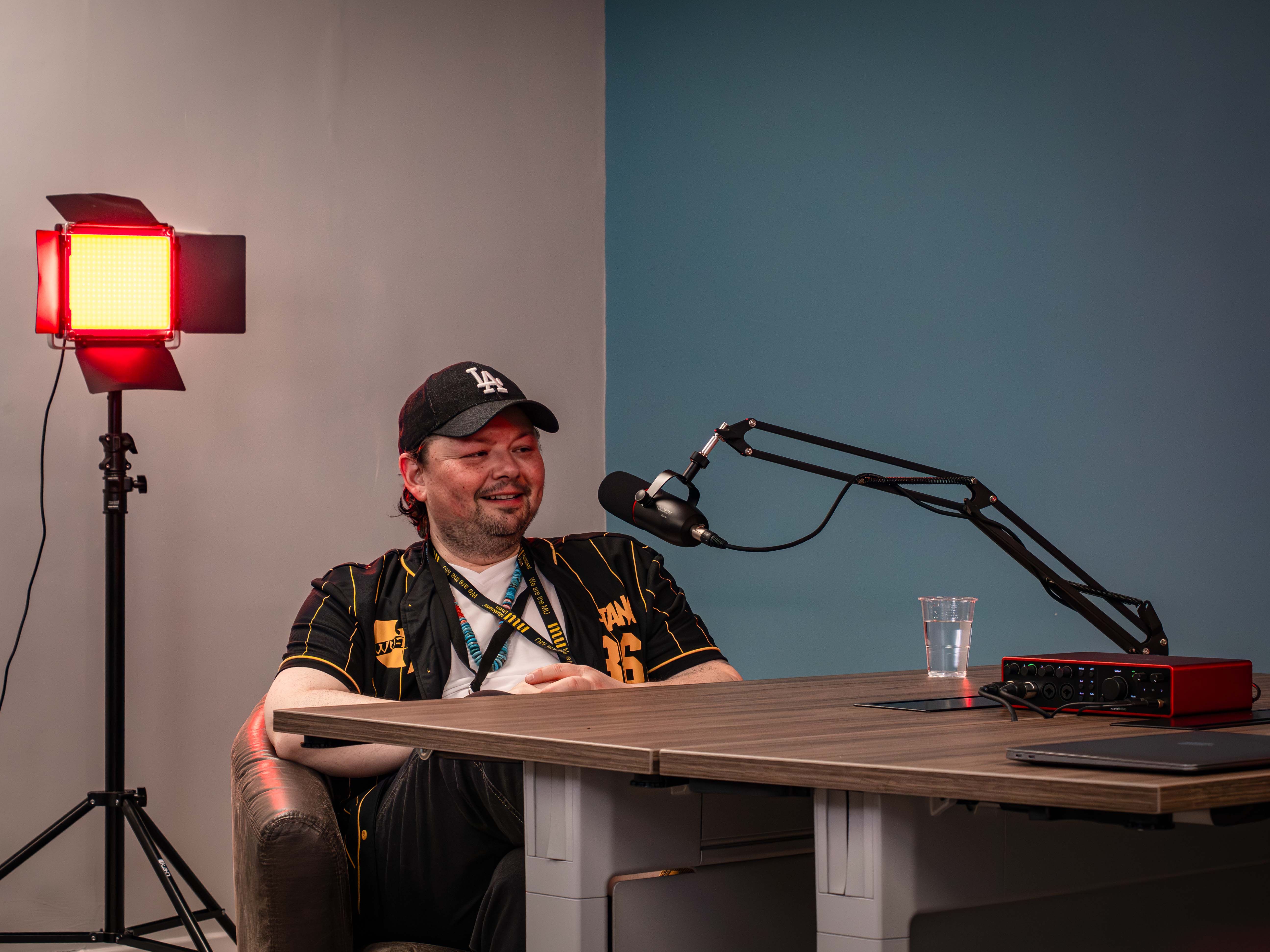 Person sitting in a chair with camera equipment and lighting in the background
